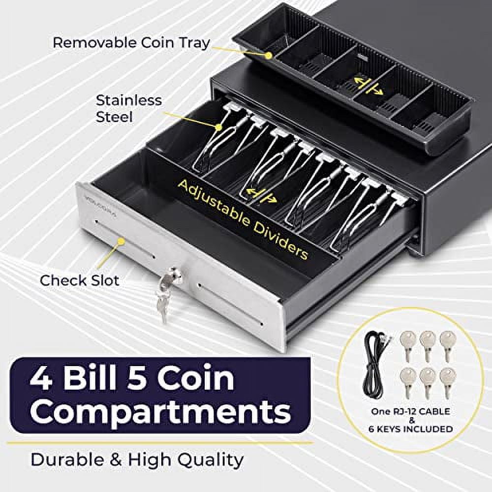 Mini Cash Register Drawer For Point Of Sale Pos System With 4 Bill 5 Coin Cash Tray Black And Stainless Steel Front Cash Drawers Removable Coin Compartment 24v Rj11 Rj12 Key Lock Media Slot
